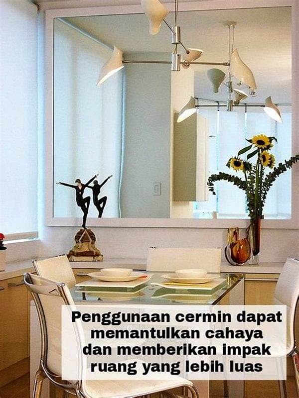 3. Gunakan cermin: Menempatkan cermin besar dapat menciptakan ilusi ruang dua kali lipat lebih besar. Dalam tips maksimalisasi penggunaan ruang kecil, cermin adalah elemen dekorasi penting.